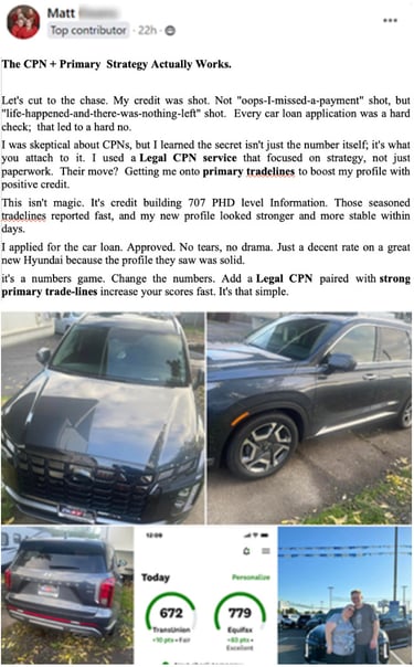 Building a CPN for maximum credit funding and creating the strongest expectation of approval requires time, knowledge, and experience. With 18 years of client success and thousands of real-world approvals, we are the experts in helping you gain loan and credit approvals.